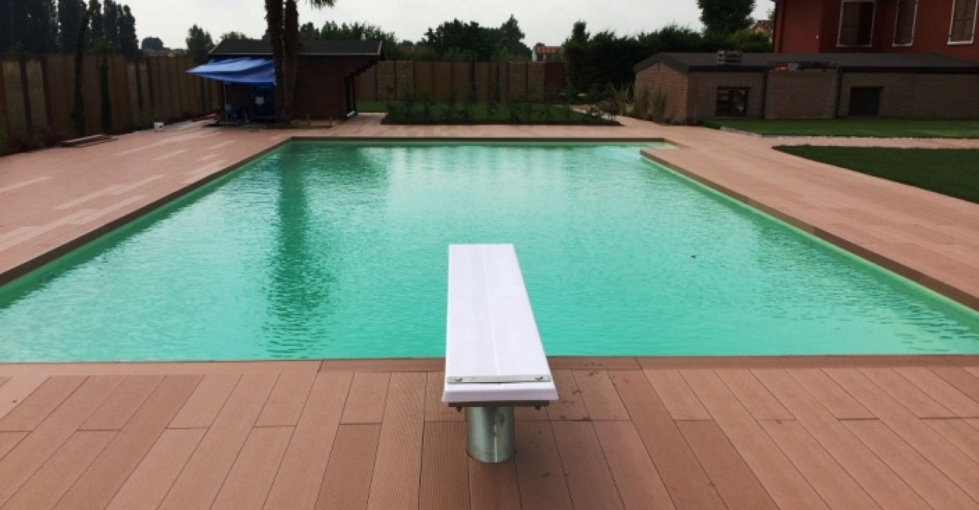 Reinforced concrete spillway skimmer pool Side entrance staircase Dimensions 17 x 8 m. RGB LED lights Salt sterilization system with automatic dosing control unit External plastic-wood flooring
