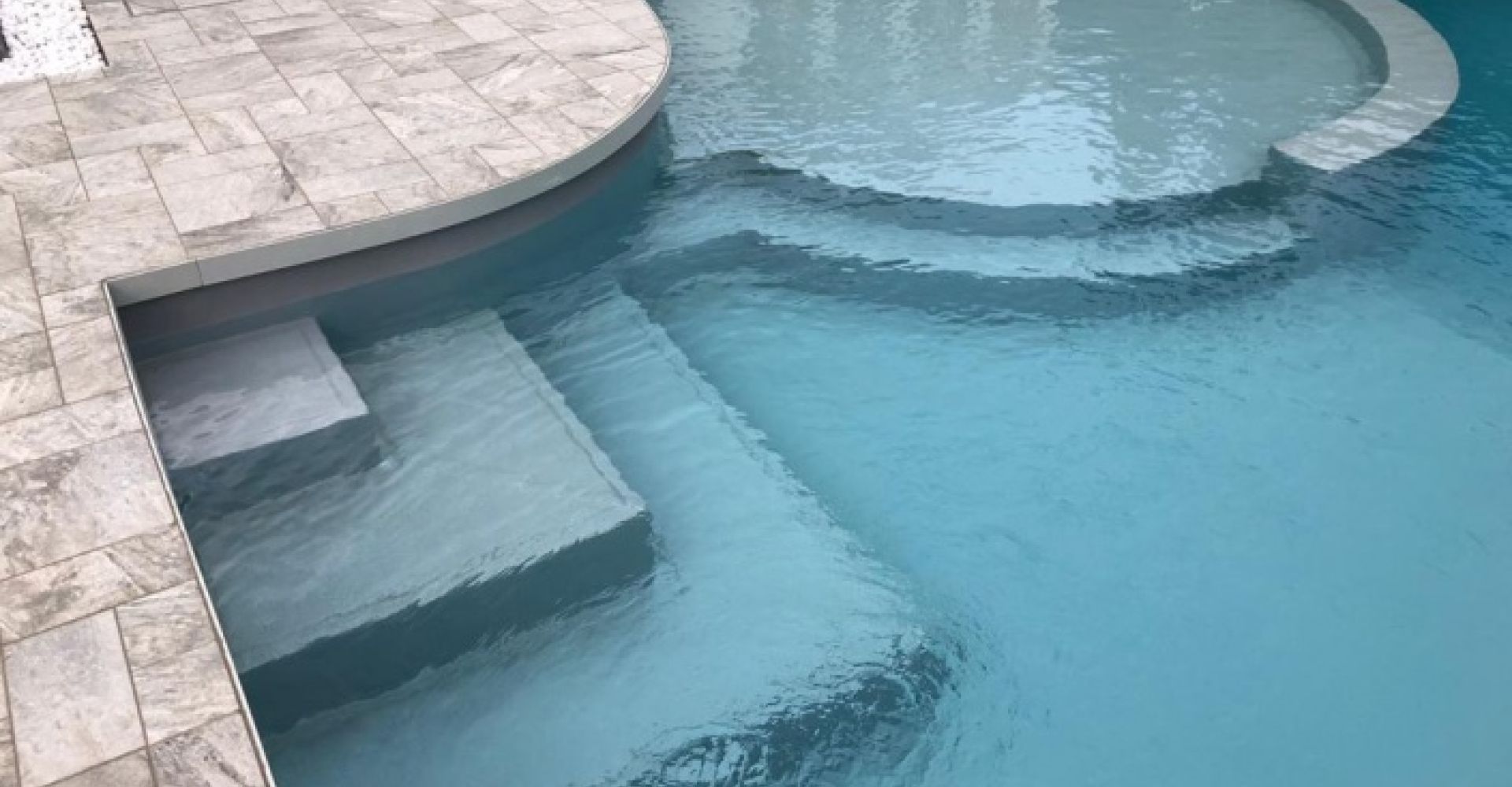Free-form swimming pool 9.00 x 3.80 with lateral relaxation pool built with BCP system and reinforced concrete, version 1 with stamped flooring version 2 with porcelain stoneware flooring